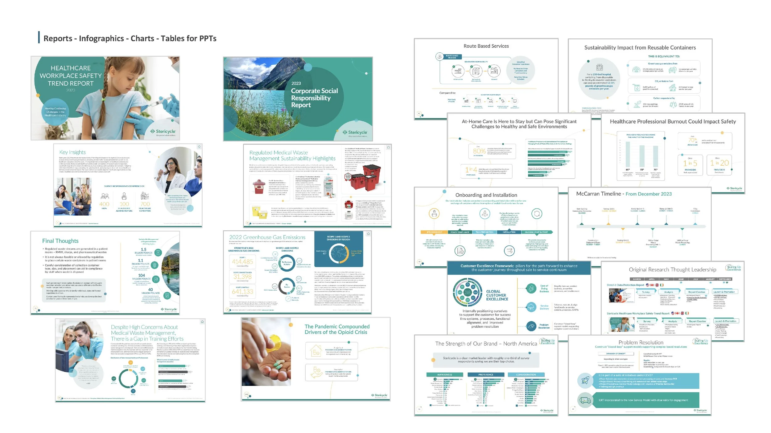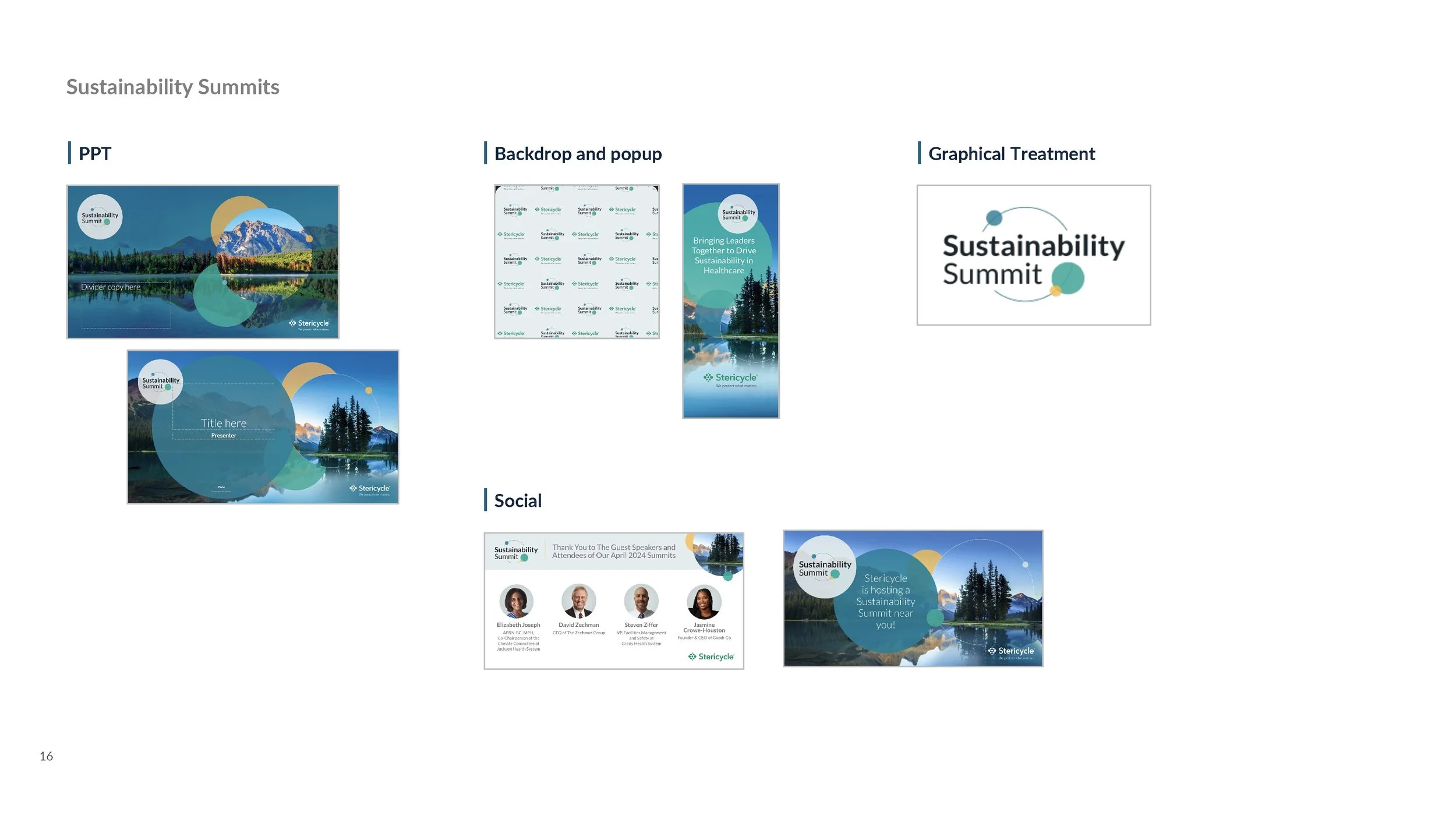 For Stericycle, I designed presentation decks that organized dense content into simple, visually cohesive slides. I streamlined the information, built custom graphics, and aligned everything to brand guidelines to make the material easier to understand and more engaging for internal and external audiences. Along with the presentations were also graphics created for the events some of the PPTs were used in such as the Sustainability Summit. These included banners, backdrops, logos, website banners and social posts.